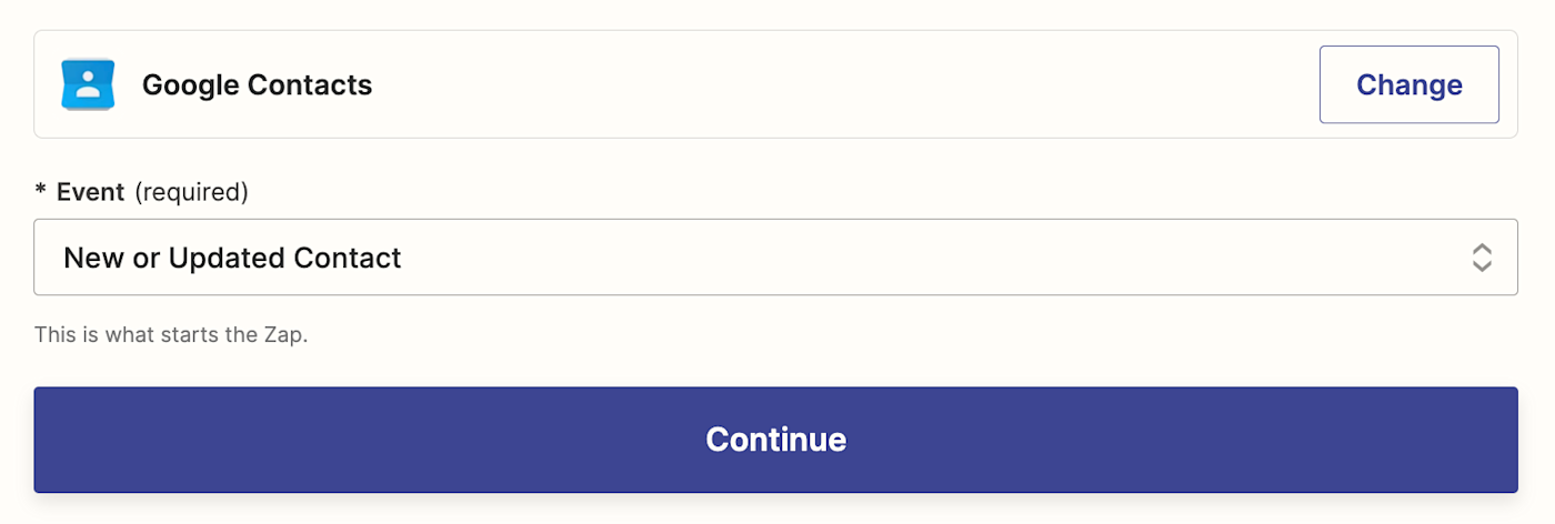 If you're creating a Zap from scratch, select Google Contacts as the app, New or Updated Contact as your Event, and click Continue. (If you're using our Zap template, this part will already be set up for you.)