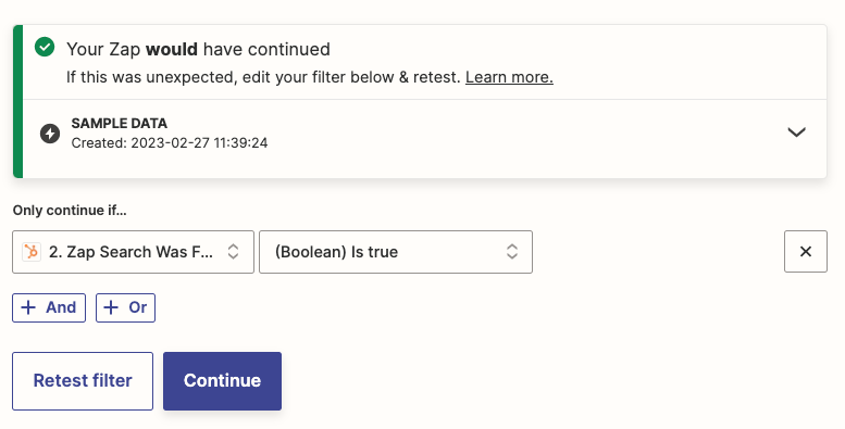 If your _zap_data_was_found is true, the Zap will continue onto this step—which filters your existing HubSpot contacts, so they can be updated correctly. If your _zap_data_was_found is false, a new HubSpot contact will be created. If you're using our Zap template, a filter step will already be set up for you.