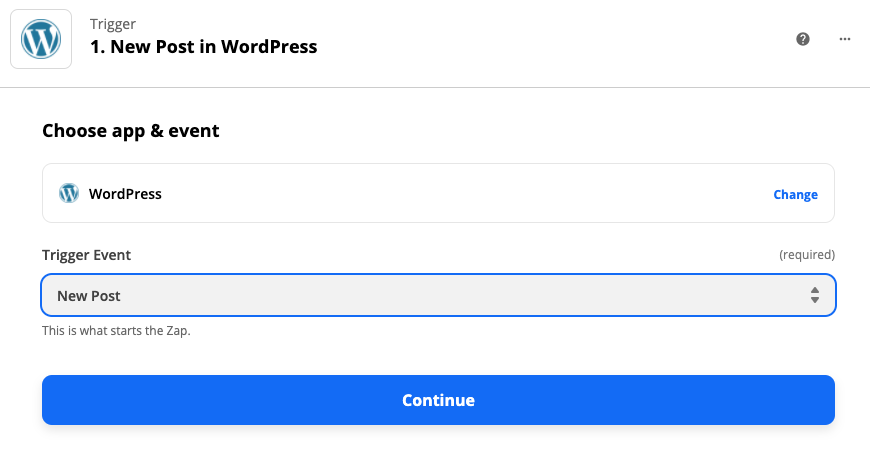 Once you're in the Zap editor, you'll need to set up your trigger first. A trigger is the event that will start your Zap. Search for and select WordPress as the trigger app, New Post as the trigger event, and click Continue.