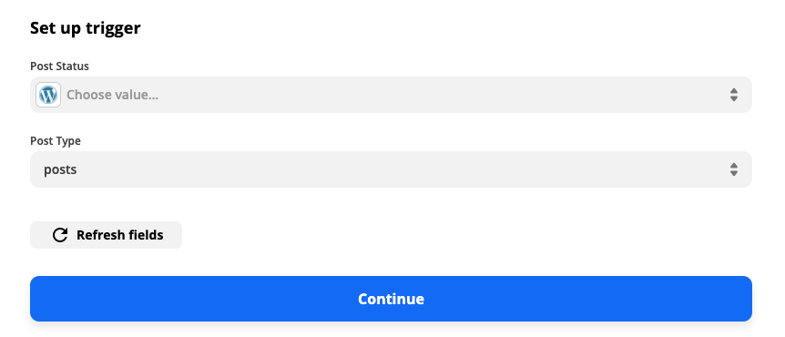 Zapier will need to find a recent WordPress post to set up the rest of the Zap. Click Test trigger. Once Zapier has your test data, click Continue with selected record.Â