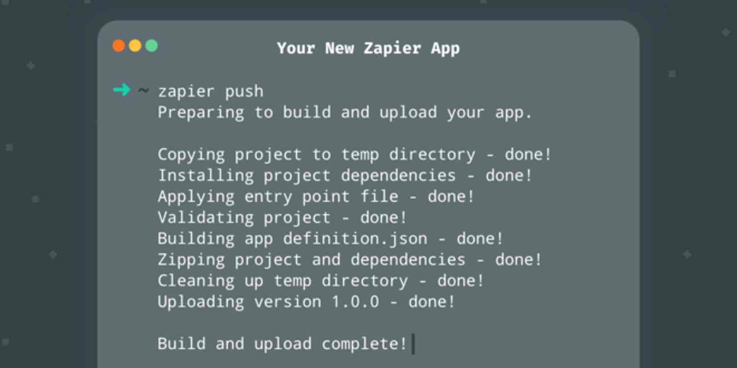 So we got to thinking, shouldn't you be able to build Zapier integrations from the command line, too? Starting today, you can: Zapier's brand new CLI tool lets you ship code directly from the command line, so you can build integrations in a way that fits your workflow.