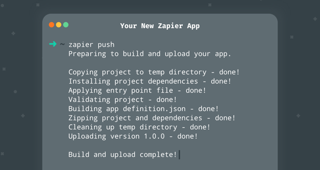 So we got to thinking, shouldn't you be able to build Zapier integrations from the command line, too? Starting today, you can: Zapier's brand new CLI tool lets you ship code directly from the command line, so you can build integrations in a way that fits your workflow.