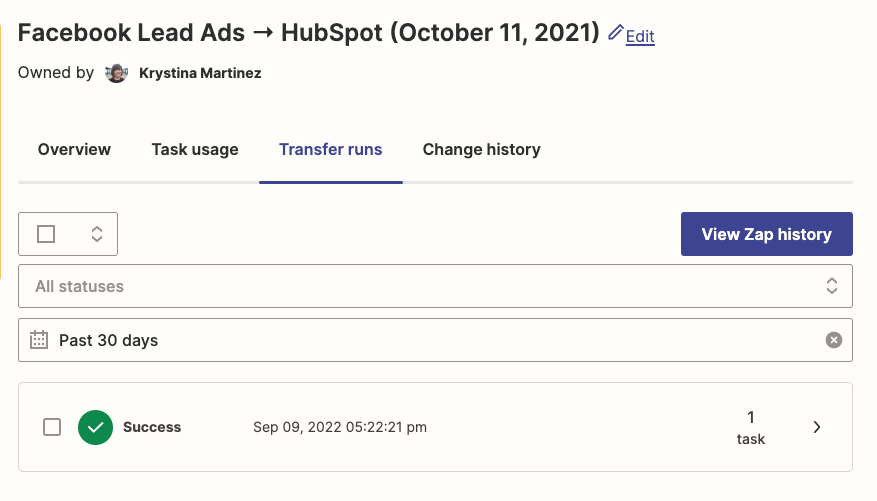 Once you've opened your Zaps, locate the workflow with the app data you want to transfer, then click on it, which will open it up in the Zap editor. Next click the arrow dropdown on the top of your screen (next to the Zap's title) and select Transfer data from the dropdown menu.