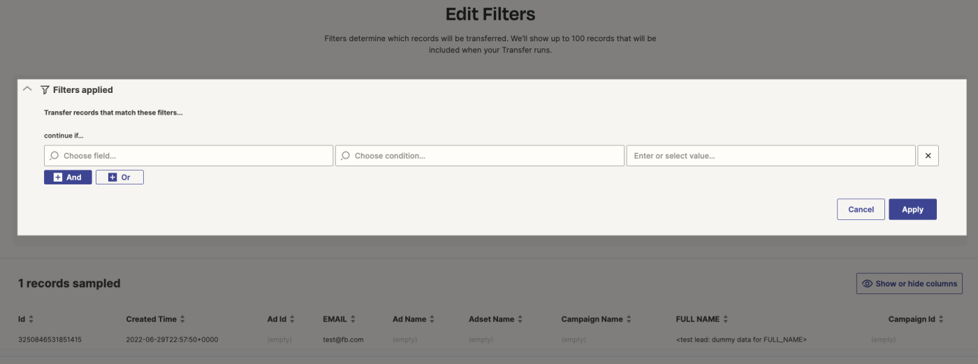 Alternatively, you can transfer certain records that match a specific criteria. To do this, click the arrow icon that's next to your Filter icon.