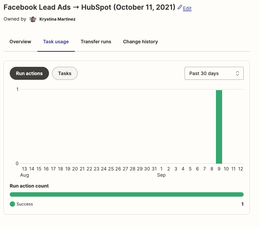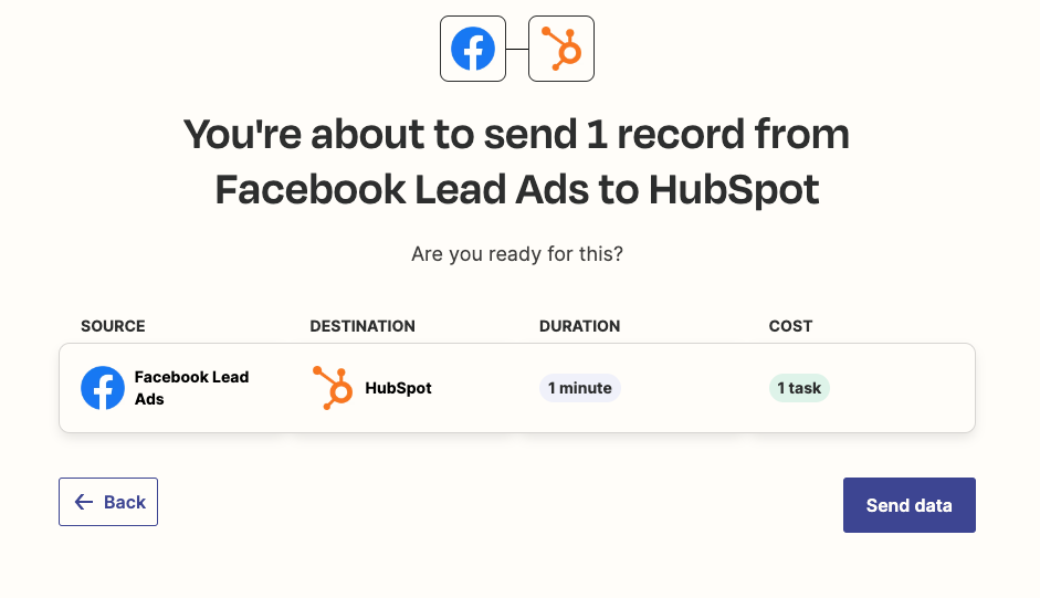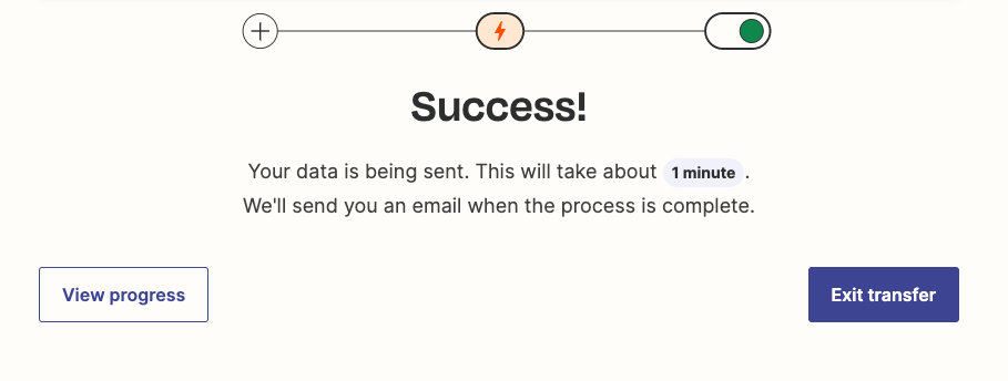 If everything's working correctly, you'll see a success sign. It can take a few minutes to send all your data, depending on the amount of records you're sending, but Zapier will list the timeframe.Â