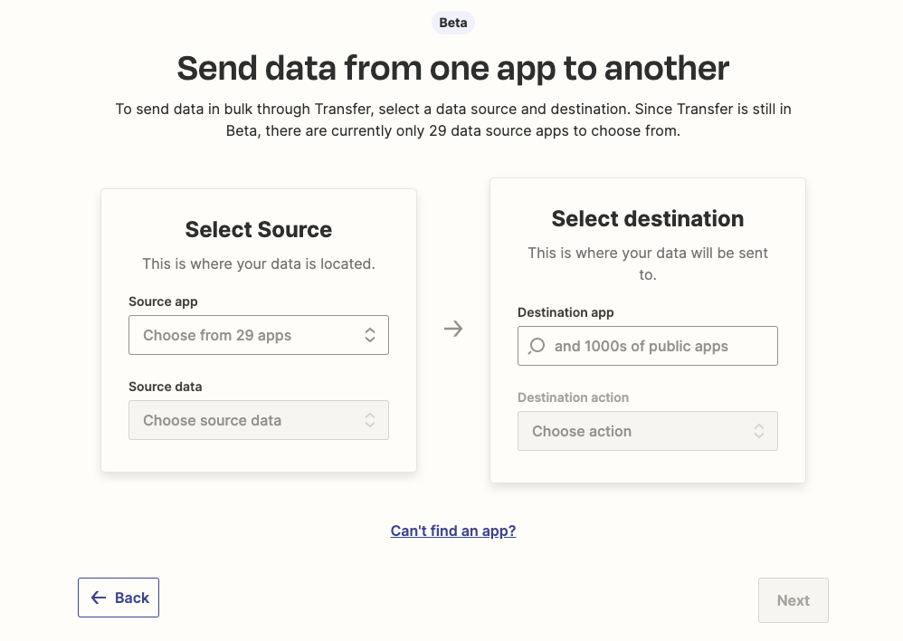 Note: The option to transfer existing data from a source app to another depends on whether your trigger app is supported. You can see the full list of supported apps here. Any app with a Zapier integration that has actions can be used as a destination app.