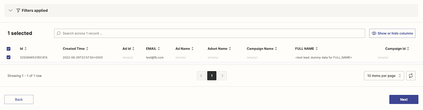 Once you see your test results, check them and make sure you have the data you want. If something looks off, make adjustments to your trigger criteria if needed, and retest until you get the information you want. Once you're happy with the results, click Continue with selected record.