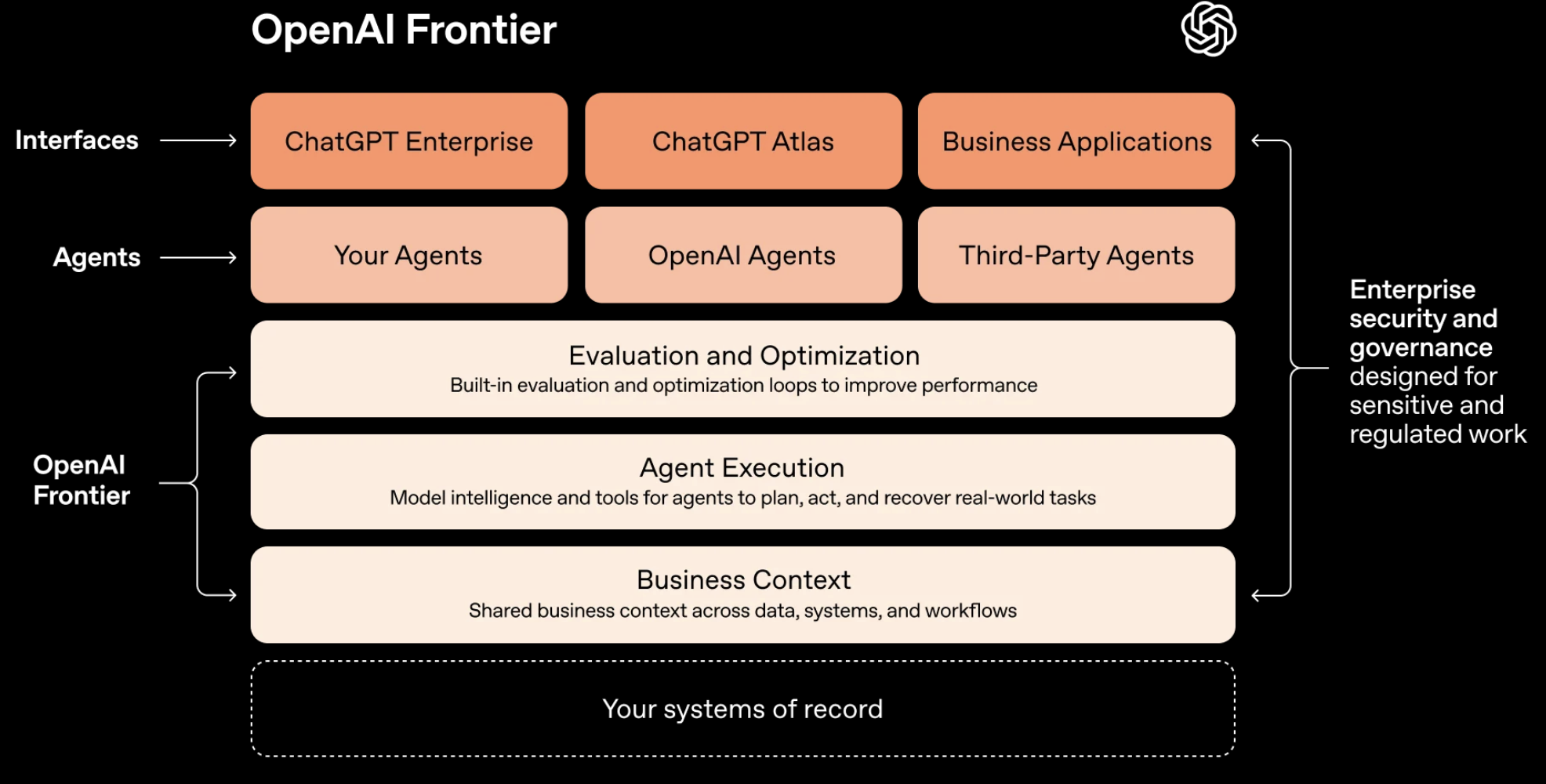 Interfaces and agent types: Frontier supports multiple interfaces—ChatGPT Enterprise, ChatGPT Atlas, and custom business applications—and works with your own agents, OpenAI's agents, and third-party agents from the partner ecosystem.