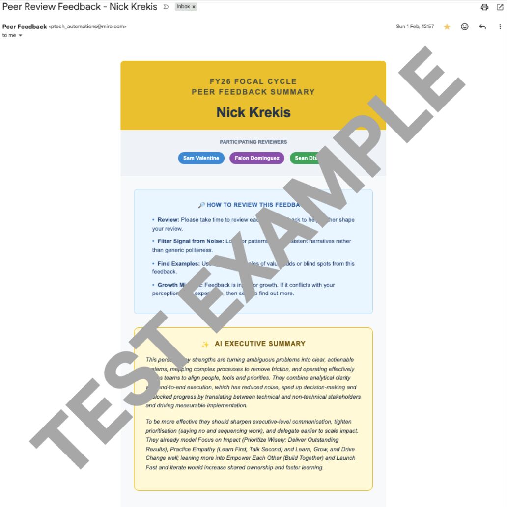 Miro's engineering org ran a peer feedback cycle every performance period. Participation sat at 50%. Around 400 reviews submitted from a team of engineers who gave each other feedback constantly in every other context.