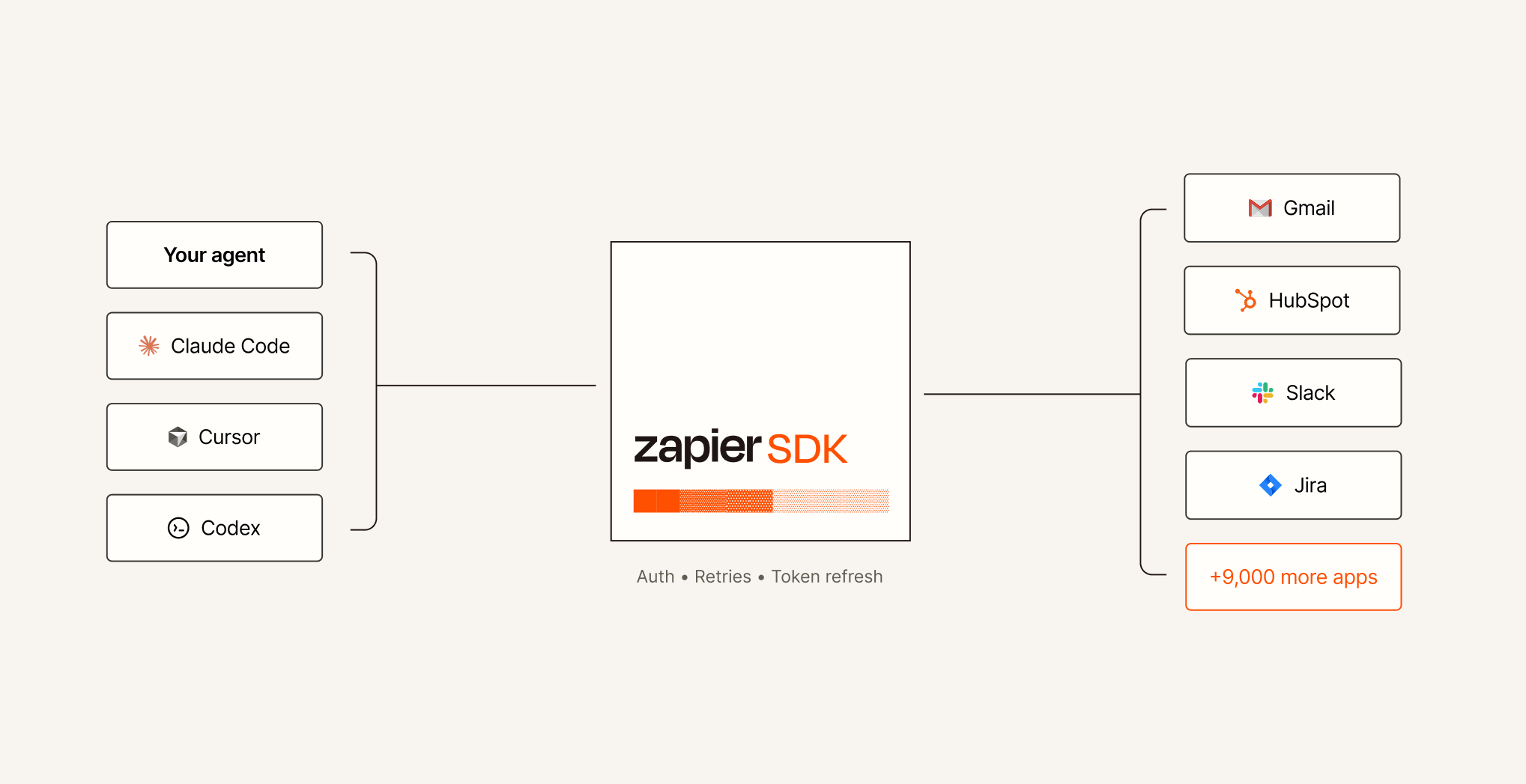 Already building in Cursor or Claude Code? Install SDK in 5 minutes. Your agent calls the same interface you do — Zapier handles auth, retries, and governance so neither of you has to.