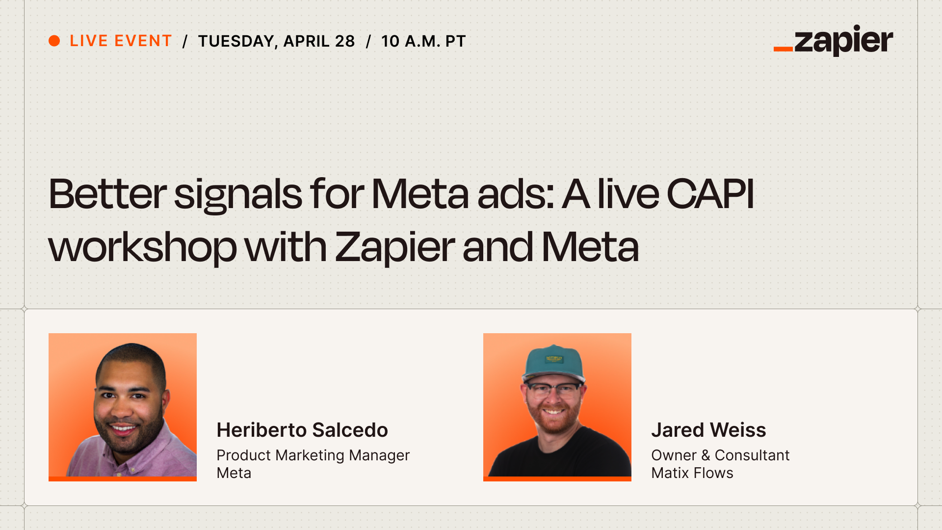 Meta and Zapier are teaming up to help advertisers get more reliable conversion data.Server-side Conversions API (CAPI) helps Meta see real outcomes, not just clicks. In this live workshop, We’ll not only walk through why CAPI matters, but we’ll build together too: connect your stack to Meta CAPI using Zapier—no code required. Come ready to build; leave with a clearer path to stronger signals and better attribution.