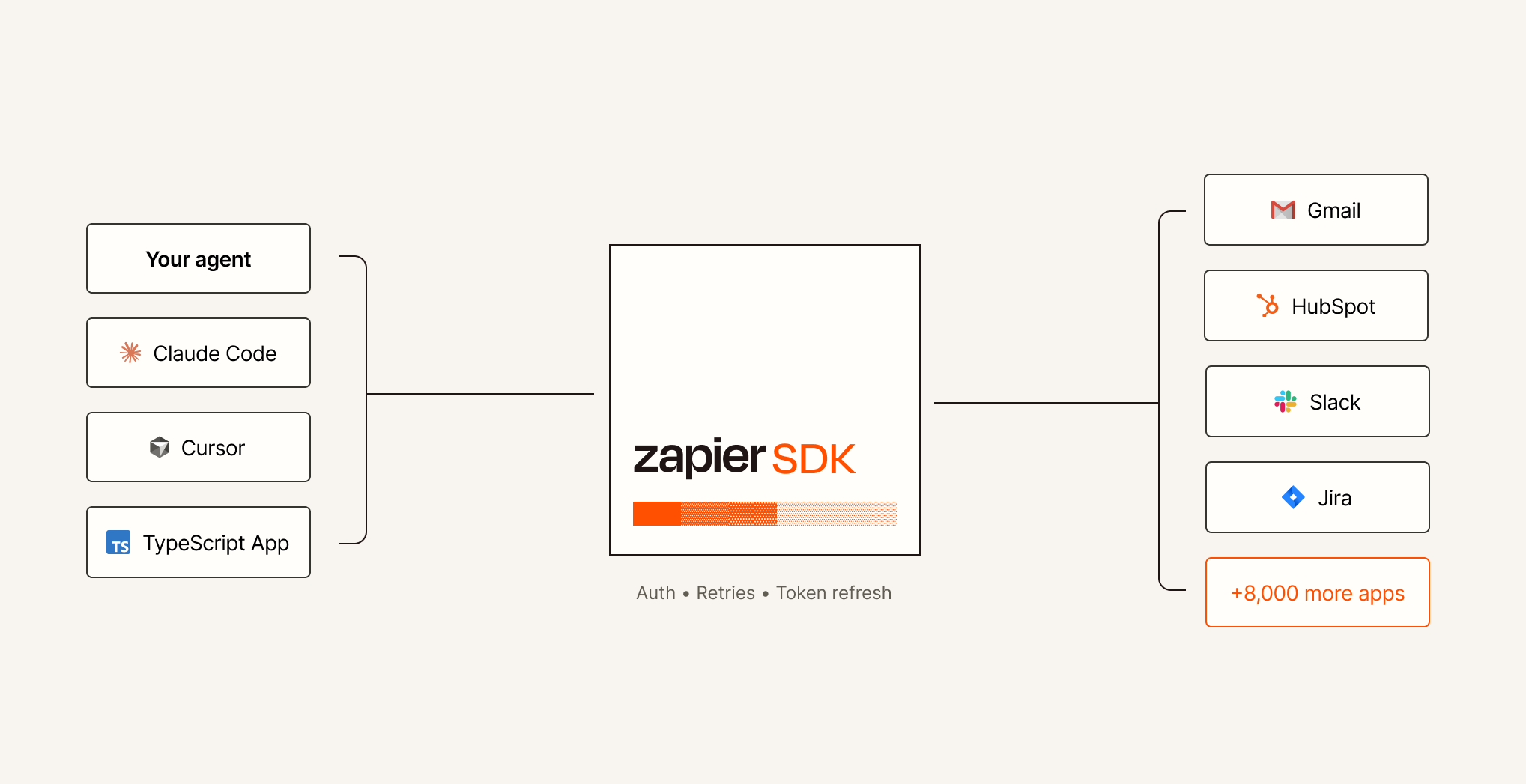 Already building in Cursor or Claude Code? Install SDK in 5 minutes. Your agent calls the same interface you do — Zapier handles auth, retries, and governance so neither of you has to.
