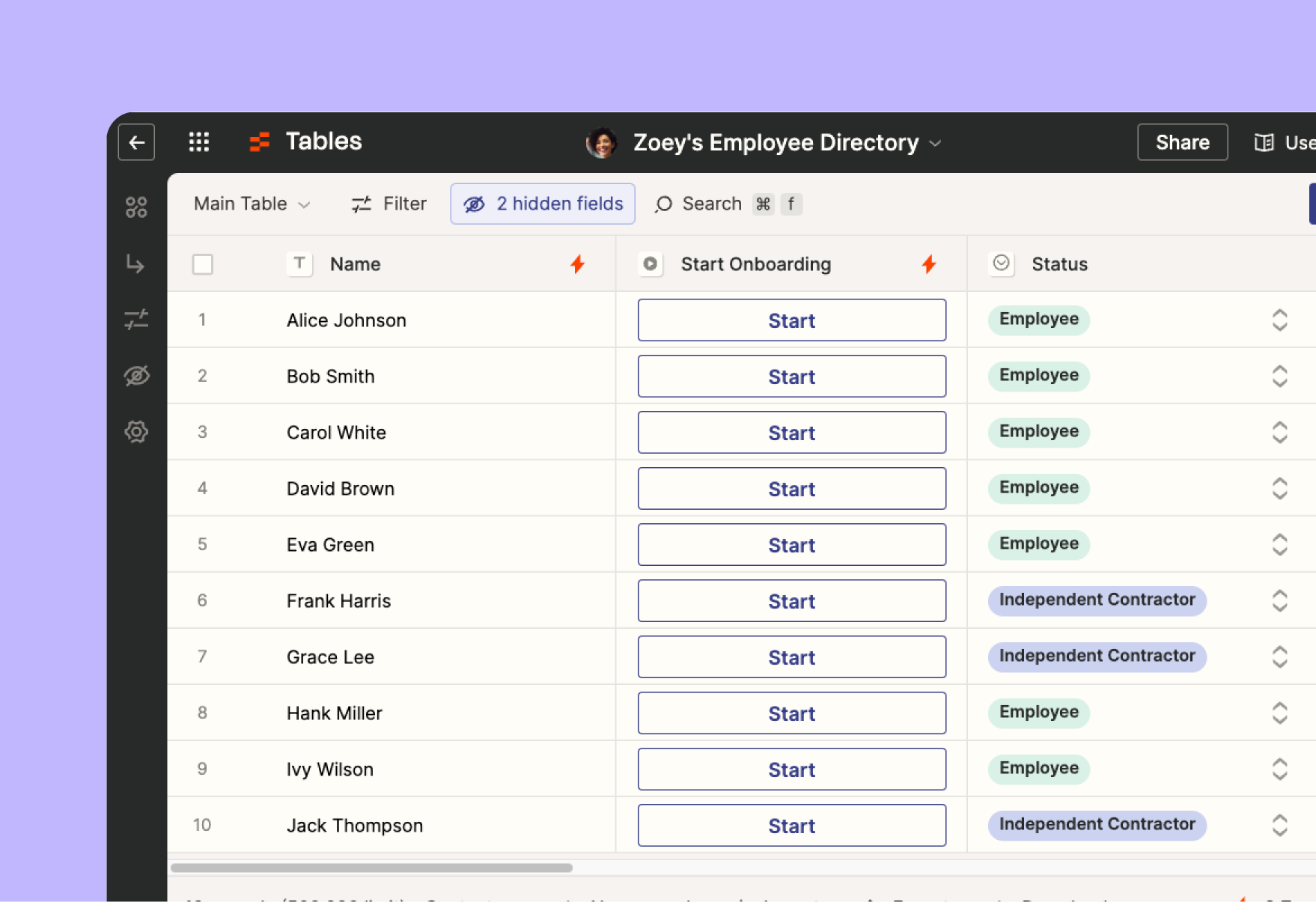 This template uses Zapier Tables and Workflows (Zaps). It includes the employee directory table with all the necessary personal information you need for your employees like phone numbers, job titles, employee name, office location, email addresses, and employment status with the ability to customize and add more fields. Simply start adding employees.
