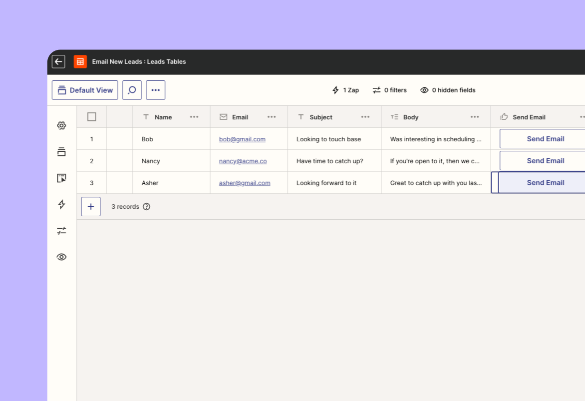 The lead tracker template harnesses the power of Zapier Tables to store and manage lead information, including name, email address, subject line, and email body. It also features a "Send email" button that triggers an Email by Zapier action to send personalized emails to your leads. The template is driven by a single Zap, which is enabled by default and runs when the "Send email" button is clicked.